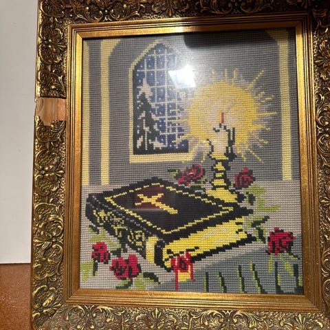 Broderede tekstiler og vægophæng med blomster og landskabsmotiver