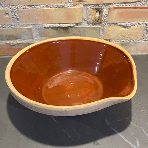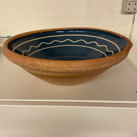 Stort gammelt dejfad dania nr. 5. Glasuren er uden store dybe ridser og krakkeleringer, dog mindre riser efter brug. På ydersiden er der naturlige brugsspor.