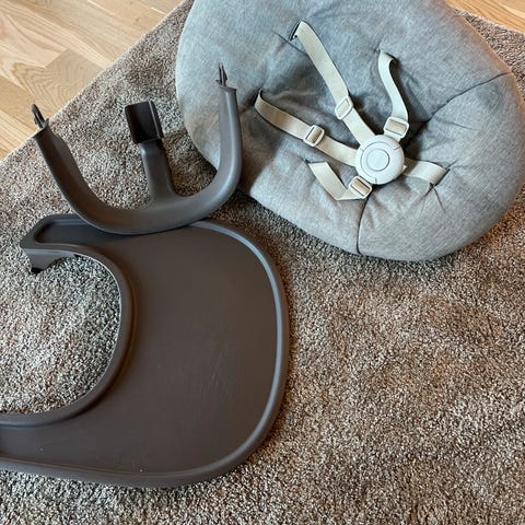 Babyindsats til Stokke Nomi højstol. Grå med seler. Brugt men I fin stand.
