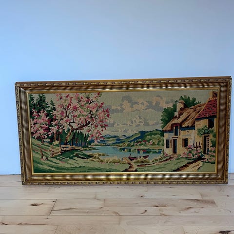 Gobelin broderi vægophæng med motiv af et hus ved en å med træer og blomster, indrammet i en dekorativ gylden ramme.