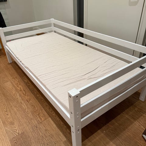 Halvhøj, hvid juniorseng fra Hoppekids sælges i målene 70 * 160 (De ydre mål er ca. 82 cm brede, 165 cm længde og 105 cm højde). Sengen har brugsspor, klistermærker og en brækket lamel (se billeder), men den fungerer upåklageligt og vores søn er desværre vokset ud af sin hyggelige hule-seng. Pris sat efter disse brugsspor, og at den ikke bliver skilt af ved afhentning 👍🏻