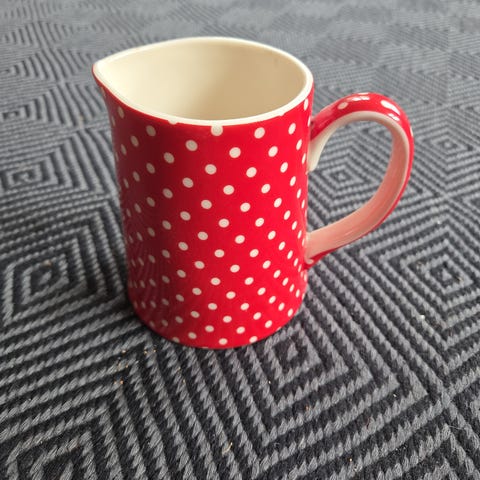 GreenGate kande med rød og mønstret design. Kanden har et håndtag og en tud til nem hældning. Velegnet til servering af drikkevarer.