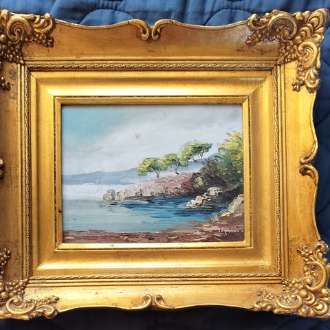 Maleri forestillende en kvinde, der står ved en kommode i et rum med flere billeder på væggen. Maleriet er indrammet i en dekorativ gylden ramme. Bagsiden af maleriet viser lærred og ophængningssnor. Malet af O. Søndergaard en gang for mange år siden. Bagsiden er osse spændende.