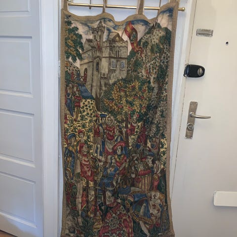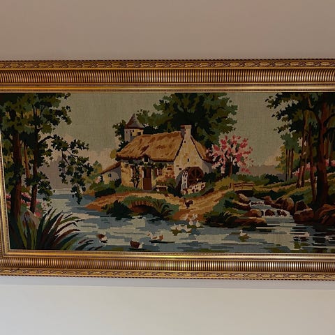 Gobelin broderet vægtæppe med motiv af landskab med træer, blomster og hus. Vægtæppet er indrammet med en dekorativ guldramme. Farverne inkluderer grøn, rosa, blå og beige.