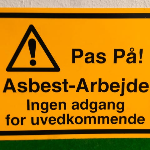 Gammelt, men velbevaret rødt plast skilt, der henviser til BRAND MATERIALE.