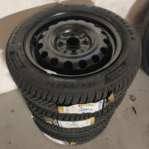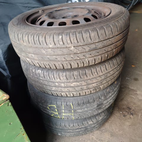 Alufælge i str 5x14". ET:35. med Yokohama sommerdæk i str 165-70-14 med ca 4-5mm mønster.