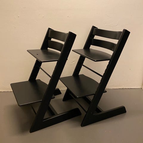 Stokke Tripp Trapp højstol i sort træ. Designet til børn med justerbar sidde- og fodplade for optimal støtte og komfort. Højstolen kan bruges fra spædbarnsalderen med tilbehør og tilpasser sig barnets vækst. (Pris pr. stk.)