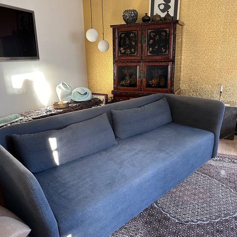 Mindre trådfejl på én pude samt enkelte små skjolder (se billeder, ikke renset forud for salg – men forventes meget let at fjerne).