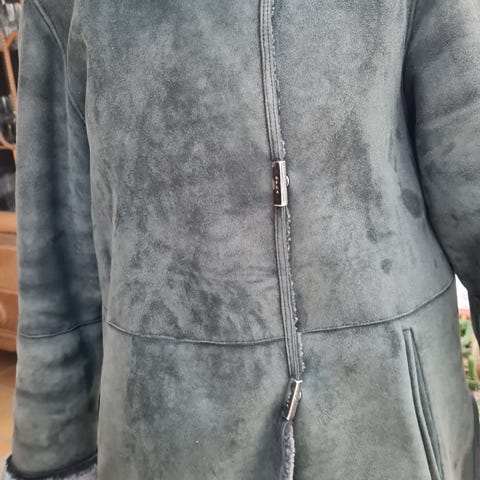 Utrolig velholdt og pæn halvlang frakke med både knapper og lynlås. Med stor hætte og to lommer.
