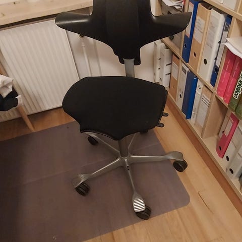 HAG Capisco kontorstol med blå polstring. Designet af HÅG. Stolen har et unikt sæde og ryglæn med justerbar højde og bevægelse. Understellet er lavet af metal med hjul, hvilket gør den mobil og stabil.