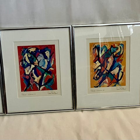 Grom Eriksen tryk, abstrakt motiv med, indrammet bag glas. Maleriet indeholder nuancer af blå, gul, orange og rød.