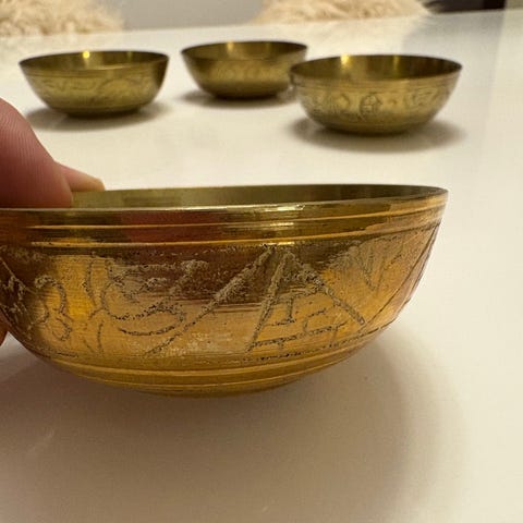 Sæt bestående af 6 tin skåle i forskellige størrelser og former. Skålene har en patineret overflade og varierede kantdetaljer. Materialet er tin fra 1900 tallet - skønvirke samleropjekt , og de kan anvendes til opbevaring eller dekoration.
