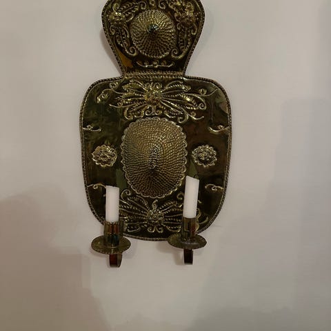 Antik vægophæng til stearinlys fremstillet i metal med dekorative detaljer. Vægophænget har flere arme til placering af stearinlys.