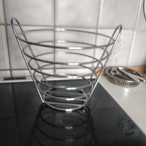 Frugtkurv i hvid metal med tre niveauer til opbevaring af frugt eller andre småting. Kurven har et dekorativt design med runde former og er egnet til brug i køkken eller spisestue. Den har lidt patina.