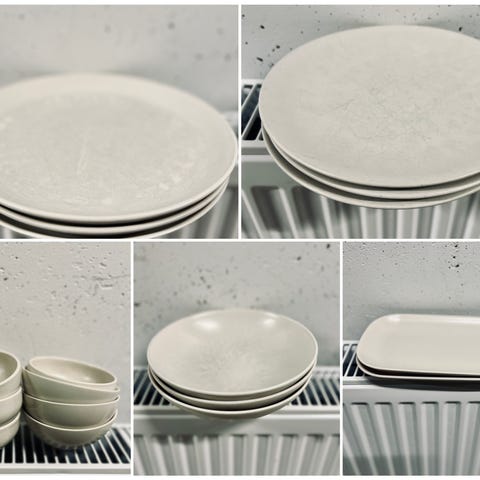 10 stk Råhvid/beige ca 22 cm og 10 stk grå ca 27 cm er fra Höganäs Keramik. De små råhvide er SOLGT.
