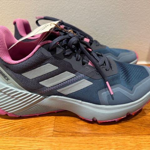 Et helt nyt par Adidas Terrex vandresko i størrelse 43 1/3 sælges. Skoene er sorte og designet til vandring med slidstærk ydersål og komfortabel pasform.