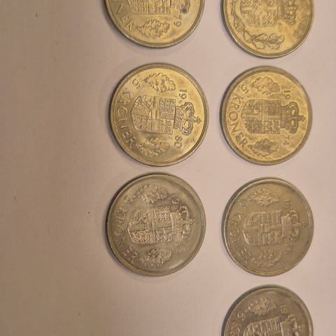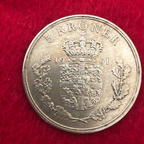Danmark 5 Kroner mønt fra år 1960. Mønten har motiv af kongekrone og årstal på forsiden samt portræt af Frederik IX med inskription på bagsiden. Dia: 3,3 cm. Vægt: 15 g. Sælges for kr. 130. Sendes mod fragt. Afhentes i Viborg