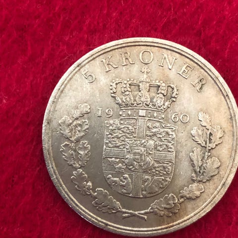 Dansk 5 Kroner mønt fra 1961 med portræt af Frederik IX. Mønten er fremstillet i metal og har klassisk dansk møntdesign med årstal og nationalt våbenskjold. Dia: 3,3 cm. Vægt: 15 g. Sælges for kr. 130. Sendes mod fragt. Afhentes i Viborg.