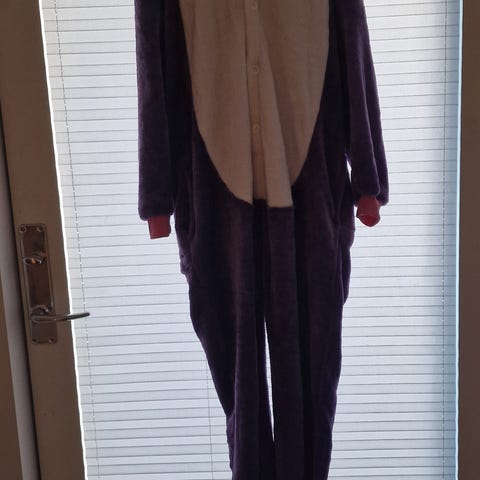 Unisex heldragt i lyseblå og hvid med enhjørning-design. Dragten har hætte med enhjørningens ansigt, horn og ører. Materialet er blødt.