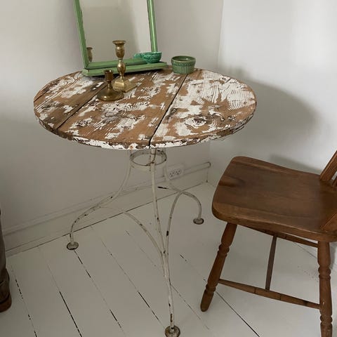 Antikt rundt bord fremstillet i lyst træ med en drejet central søjle og tre buede ben. Bordpladen har en oval form med profilerede kanter. Bordet kan anvendes som sidebord eller lille dekorativt møbel.