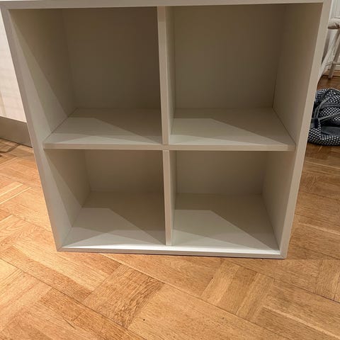 Den ene reol har en plet på toppen fra en utæt urtepotte (kan evt. skjules eller males over) og et lille hak. De to andre reoler fremstår i pæn stand med minimale brugsspor.