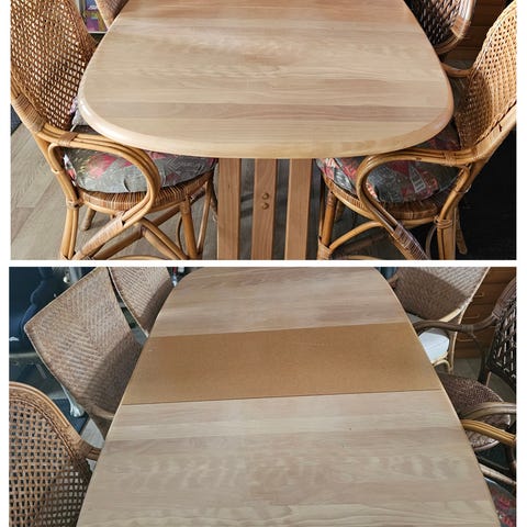 Med en enkelt tillægsplade sat i enden, som vist i bunden af billedet, er bordets samlede længde 205,5 cm.