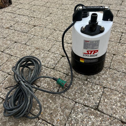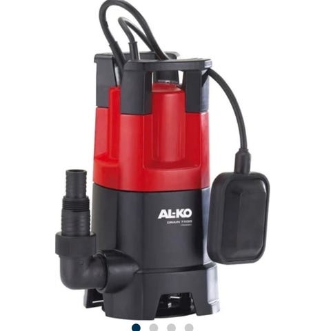 Pro Garden dræn pumpe med flyder og langt kabel. Pumpen er designet til at flytte vand effektivt og kan anvendes til dræning og tømning af mindre områder. Pumpen har en grøn og sort farve.