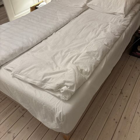 Sætter denne IKEA 'Skårer boxmadras 140x200' seng til salg. Sengen er brugt sparsomt med to topmadrasser og fremstår derfor i perfekt stand uden pletter eller andre brugsspor. Topmadrasserne, hvor den ene er af memoryfoam, kan indgå i handlen, såfremt det ønskes.