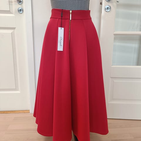 Closet nederdel i blå farve, størrelse 36, fremstillet i polyester. Nederdelen har en cirkulær form med synlige folder og lynlås i ryggen.