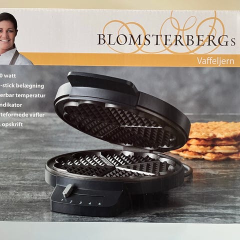 Blomsterberg vaffeljern med 5 varmeindstillinger i sort farve. Vaffeljernet har fem hjerteformede vaffelplader og en indikatorlampe for drift. Det har et rundt design og en håndtag til nem åbning og lukning. Det er kun let brugt og virker som det skal.