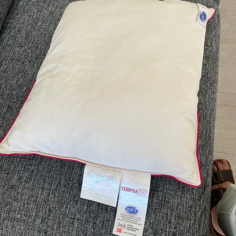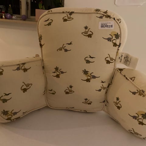 Pude til barnevogn fremstillet med fyld af økologisk naturfiber kapok og betræk af økologisk bomuld. Puden er designet til at give støtte og komfort til barnet i barnevognen.