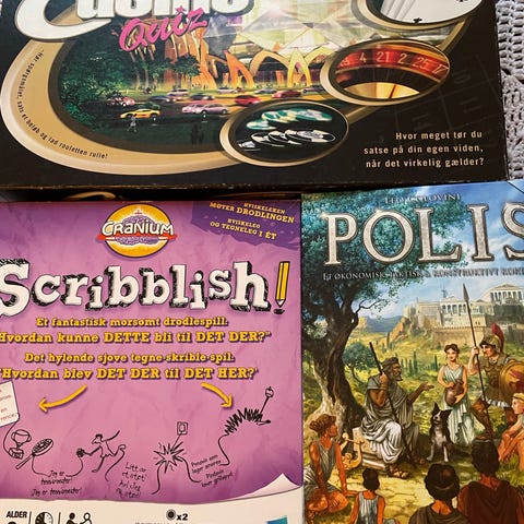 Hasbro Scribblish brætspil med spillekort, spillebrikker og terning. Spillet indeholder forskellige komponenter til kreativt tegnespil og er velegnet til flere spillere.