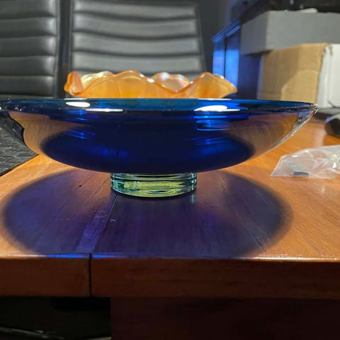 Smukt lille fad eller skål. Diameter knap 14 cm - højde ca. 4,5 cm. Det er mørkeblå på turkis fod. Designet af Anja Kjær i 1994 for Royal Copenhagen - Holmegaard Glasværk. I pæn og hel stand. Kan afhentes 8381 Tilst eller sendes + forsendelsesomkostninger.