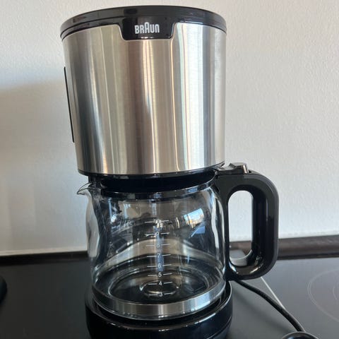 Kaffemaskine/kaffebrygger med kande i glas, sort og rustfrit stål materiale. 0,75L kande = 6 kopper.