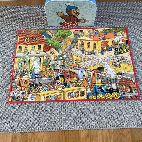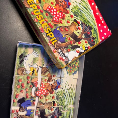 Rasmus Klump Puslespilsbog med illustrationer af Rasmus Klump og venner. Bogen indeholder puslespilselementer og historier, herunder en side med fisketur. Designet til børn og indeholder farverige tegninger. Memo spil med Disney og Peter Plys samt puslespil med Cirkeline.