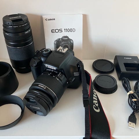 Canon EOS 1100D digitalkamera med to objektiver: 18-55mm og 75-300mm.