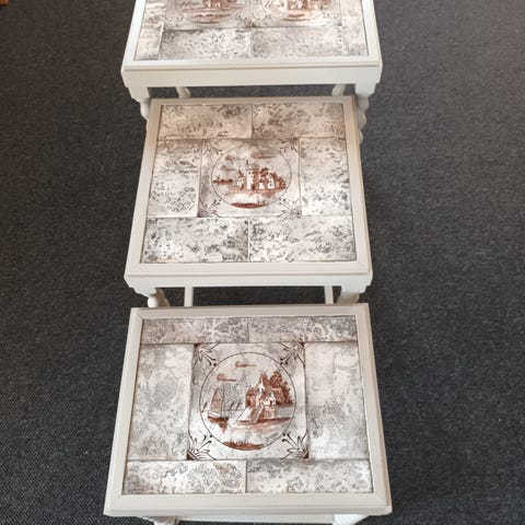 To små fine kakkelborde i egetræ med jagtmotiv samlet pris 500