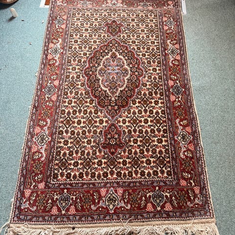 Traditionelt håndknyttet tæppe i uld på bomuld. 10 mm tykt. Ingen røg, ingen dyr.