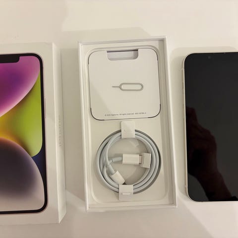 Det er en Apple iPhone 14 hvid med 128 GB samt en batteritilstand på ca. 90 % stadigvæk.