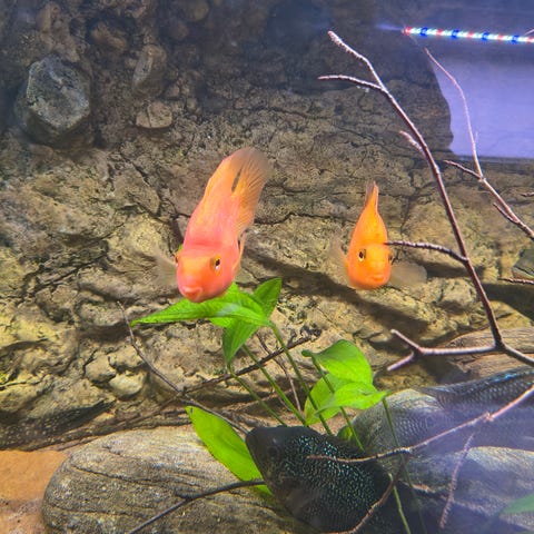 Her slipper du for selv at sammensætte et par, disse to turtelduer er klar til at rykke ind i dit akvarie, og give den gas sammen. Størrelsen er også noget at prale af, det er ikke hver dag man ser så store papegøje cichldier, med så intens farve. Det må opleves med egne øjne!