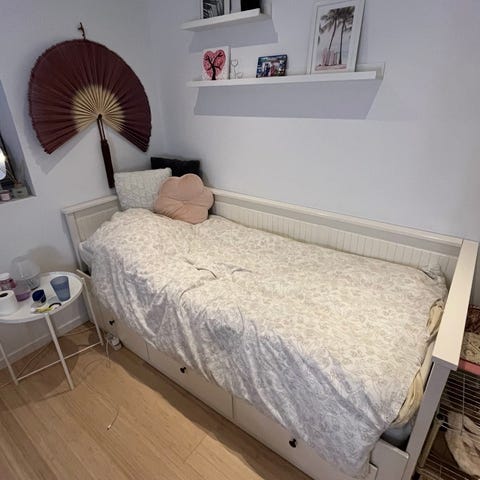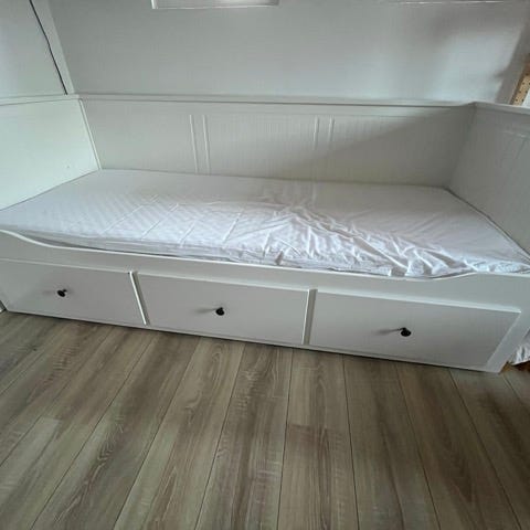 Fin Ikea Hemnes seng med 3 skuffer. Den har lidt brugsspor og en enkelt mede der er knækket, ellers i fin stand. Kan trækkes ud til dobbeltseng. 2 madrasser kan medfølge.