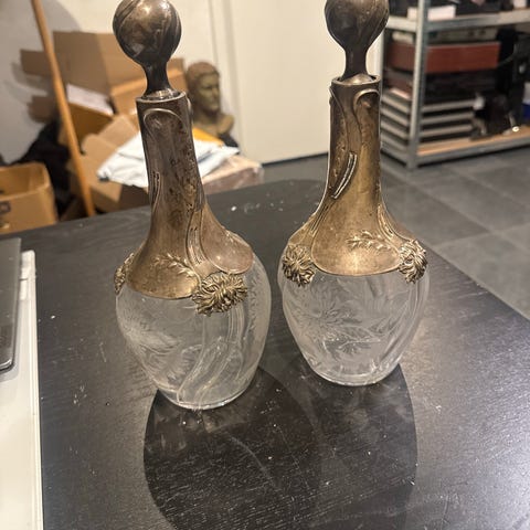 De smukkeste vintage coasters i glas og sølv. Med de fineste detaljer, såsom stjernemønster i glasset og perlestukket sølvkant.