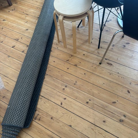Fylder 200x250, og vejer hele 8 kg. Solidt tæppe, der er blevet brugt under sofa. Fylder flot i stuen, i soveværelset eller i indgangen.