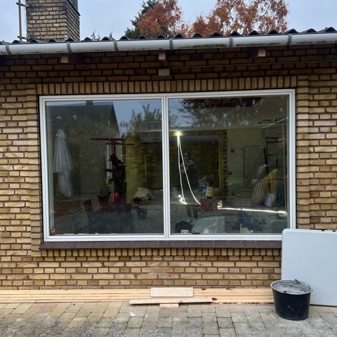 Stort fast vinduesparti med farvede blyindfattede glasruder. Måler ca 180 x 145. Træramme omkring er i god stand. Vinduet sidder i et hus der skal rives ned i starten af februar, hvorefter vinduet kan afhentes-