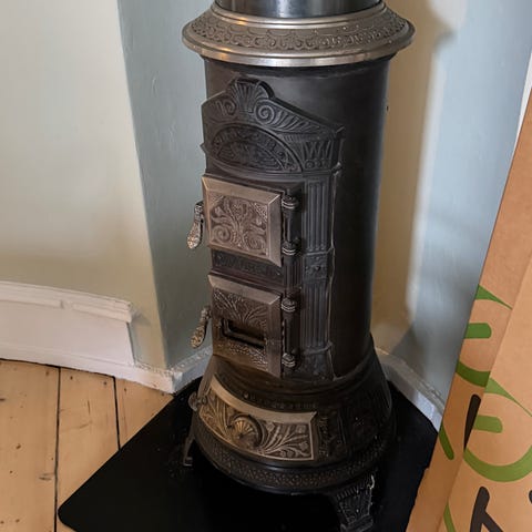 Smuk stor antik brændeovn i støbejern , den er fra før 1900 tallet og derfor ikke underlagt lovgivning om udskiftning.