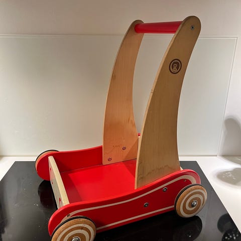 KREA træ gåvogn i rød farve med hvidt håndtag og hjul. Vognen er designet til børn og kan bruges til leg og til at lære at gå.