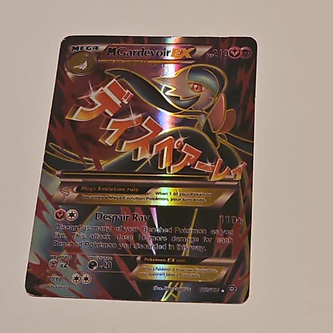 Pokémon Gardevoir holografisk samlekort med illustration af Gardevoir. Kortet indeholder angrebene Sharp Spin, Psychic Rage og Black Magic. Kortets bagside viser det klassiske Pokémon-logo med Pokéball. Kortet er velegnet til samling og spil.