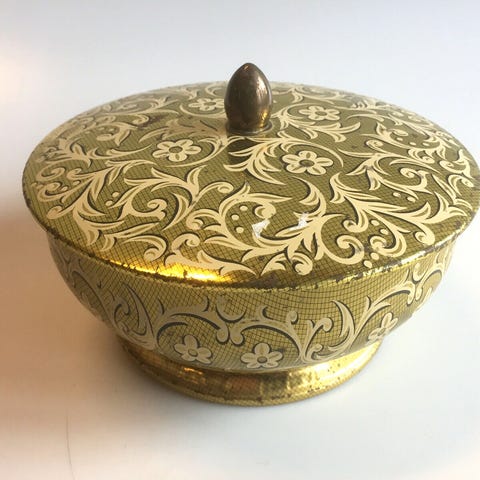 Dåsen er rund med en forhøjet, guldfarvet base. Låget har en guldfarvet knop i midten.