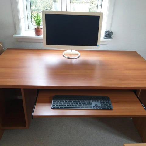 skrivebord med bagplade eller front, 150x75x75 cm., 2 stk. der kan sættes i forlængelse af hinanden eller i vinkel, den ene side er halv størrelse, pris pr. stk. kr. 400,00