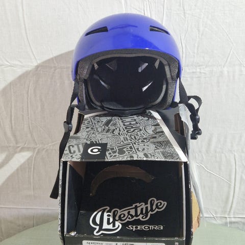 Spectra cykelhjelm med blåt og beige spøgelses design. Hjelmen har ventilation og et unikt grafisk mønster med spøgelsesillustrationer.